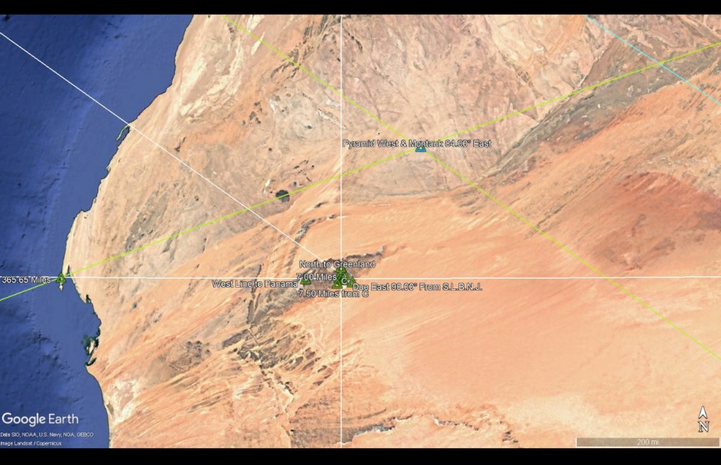 What is 90 degrees due east of the beach?